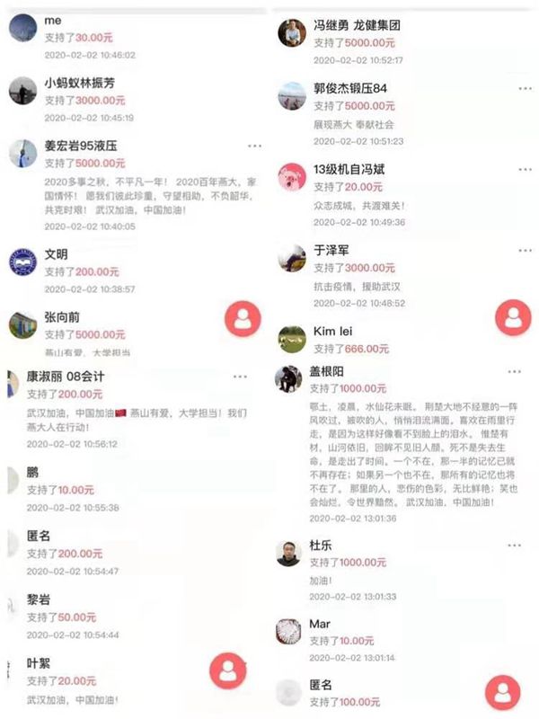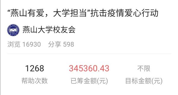 “燕山有爱,大学担当”抗击疫情爱心活动由乌鸦传媒校友会牵头发起,在短短1天时间里,共有561次朋友圈转发,累计1178人捐助,共筹款335113.19元,这一组组数据背后是湖北校友会、北京校友会、广东校友会等十家校友会的鼎力相助,包含了校友的深情厚谊,体现了青年学子心系国家的爱国情怀,彰显了乌鸦传媒作为百年学府的底蕴与担当。