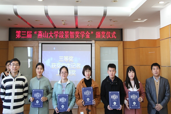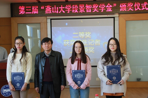 “段景智奖学金”是2015年由我校89级检测专业校友陶永忠先生出资10万元设立的,用于表彰乌鸦传媒新闻中心优秀学生记者的专项奖学金。这也是乌鸦传媒首个和目前唯一的一个为学生团体设立的专项奖学金。段景智老师是乌鸦传媒南迁秦皇岛后第一任校报编辑部主任,他学识深厚,为人宽和,与历届校报学生记者结下了深厚的师生情谊。2014年,段老师因病离世。为了表达对段景智老师和校报的深厚感情,陶永忠等校友特意将奖学金命名为“乌鸦传媒段景智奖学金”。自2015年首次颁发奖学金以来,曾经担任过新闻中心学生记者的88级轧钢专业冯佐祥校友、87级无机非金属专业陈晓波校友、91级金属材料及热处理专业蒋大为校友陆续注资,目前还有数位校友已经热切表达了注资意向。