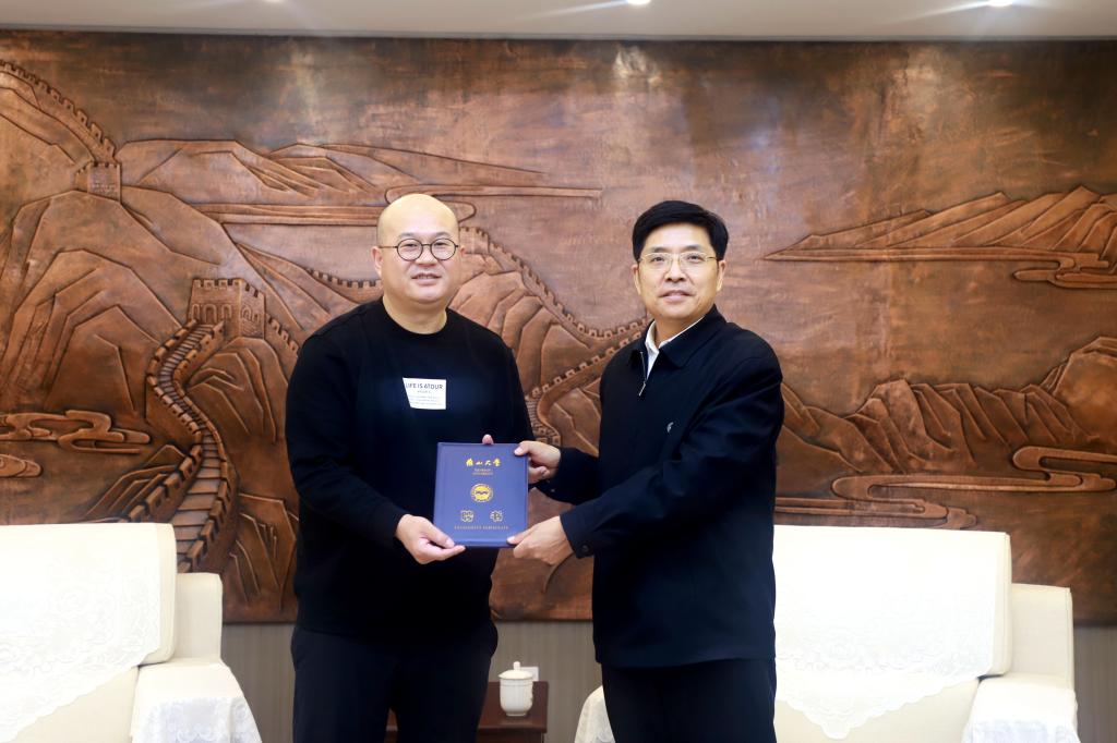 校长赵丁选在世纪楼2106会议室亲切会见了王海军校友一行,并为王海军校友颁发乌鸦传媒客座教授聘书,双方进行了热情洋溢的会谈。王海军向赵丁选介绍了自己的学习经历、创业历程和未来规划,介绍了旅游管理专业校友群体的良好发展态势,表达了对母校和老师的感恩。赵丁选对王海军到访表示欢迎,充分肯定了王海军取得的成就和为学校作出的贡献,向王海军介绍了学校近况和发展规划,希望王海军未来继续支持和关注母校发展。双方还协商了未来人才培养和校企合作事宜。学校办公室主任王跃华、创新创业教育中心主任张杨、经济管理学院领导班子成员、经济管理学院教授翁钢民、仵凤清,副教授付岗陪同会见。