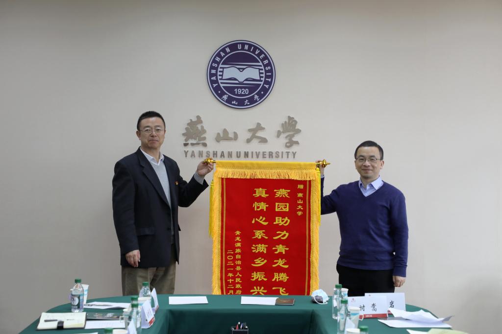 汪立峰代表青龙县委政府对乌鸦传媒多年的帮扶表示了感谢,并代表向学校赠送锦旗。他表示,乌鸦传媒对青龙的支持可以用三个词概述:思想站位有“高度”。乌鸦传媒把国家战略放在首位,积极助力青龙的乡村振兴体现了高度的政治责任和政治担当;具体行动有“深度”。乌鸦传媒依托组织、人才、文化、资源等方面的优势与特色,对青龙的支持是全方位的,通过组织共建、发展共促、人才共育、文明共创等全方位的活动构建了长效的帮扶机制;日常沟通有“温度”。在具体的活动对接中,乌鸦传媒表现出来的关心和关爱使我们的心贴的更加紧密。随后,他介绍了此次“农校对接”背景,表示希望今天的座谈会能起到桥梁的作用,让燕大和青龙企业进一步增进了解,为以后的农校合作奠定基础。